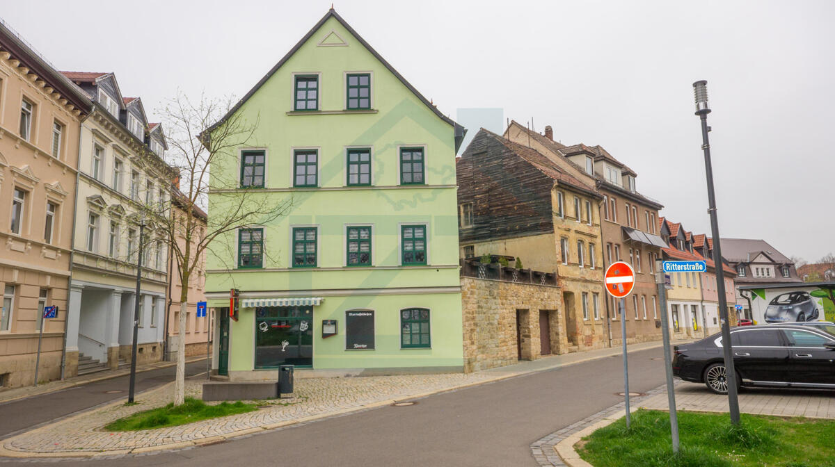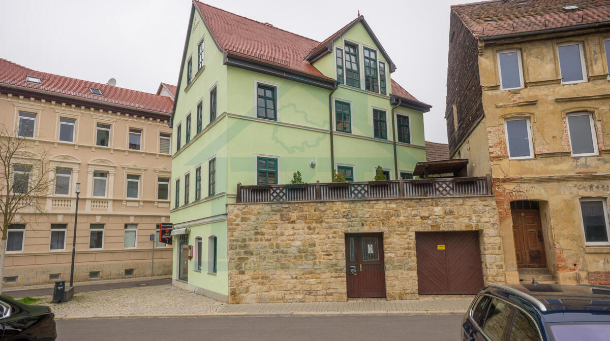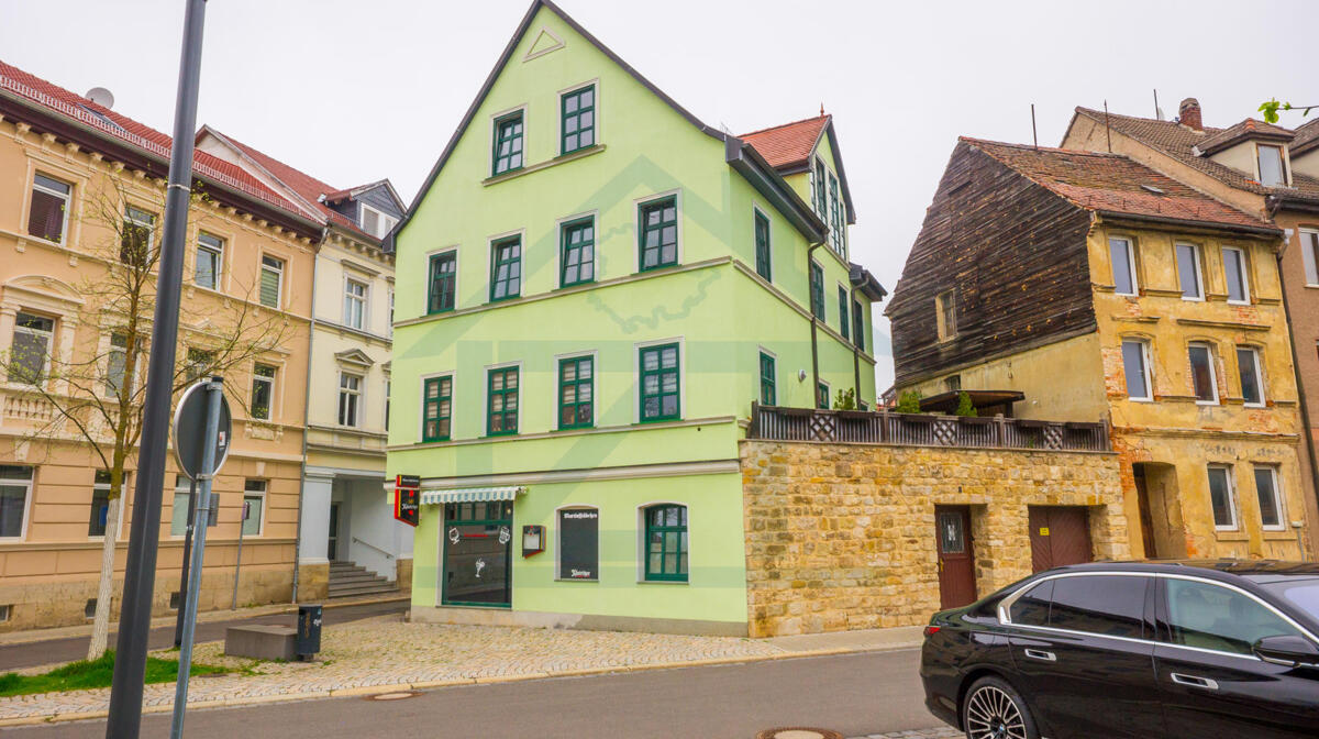 Apolda ist die Kreisstadt des mittelthüringischen Landkreises Weimarer Land an der Ilm, im Städtedreieck mit Weimar und Jena.Das Wohn- und Geschäftshaus befindet sich in einer ruhigen und trotzdem zentrumsnahen Lage mit Blick auf die historische Martinskirche in Apolda