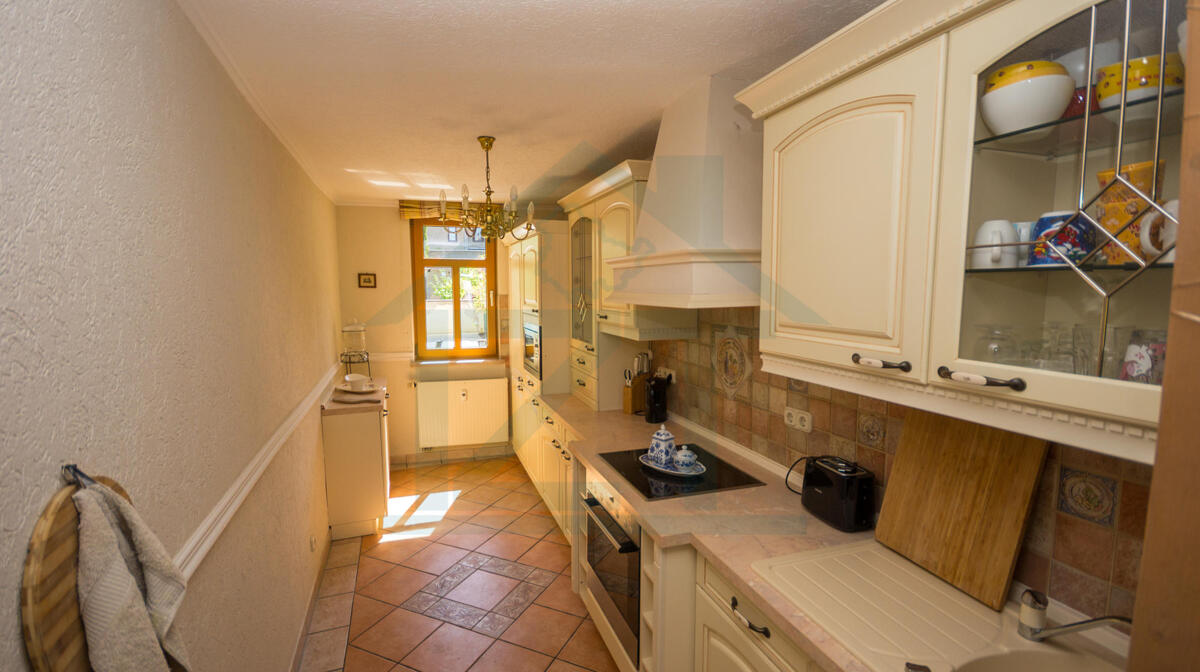 Über einen separaten Eingang im Erdgeschoss und eine Innentreppe erreicht man im ersten Obergeschoss den aufwendig sanierten Wohnbereich mit einem voll ausgestatteten Bad sowie einem offenen Wohn-, Koch- und Essbereich inklusive moderner Einbauküche. Von dieser Etage haben Sie auch Zugang zur geräumigen Süd-Ost-Dachterrasse.