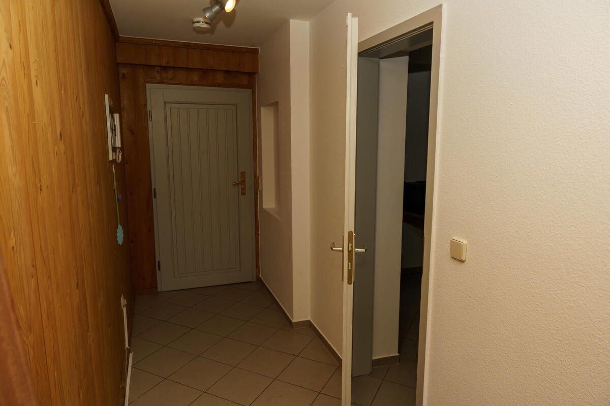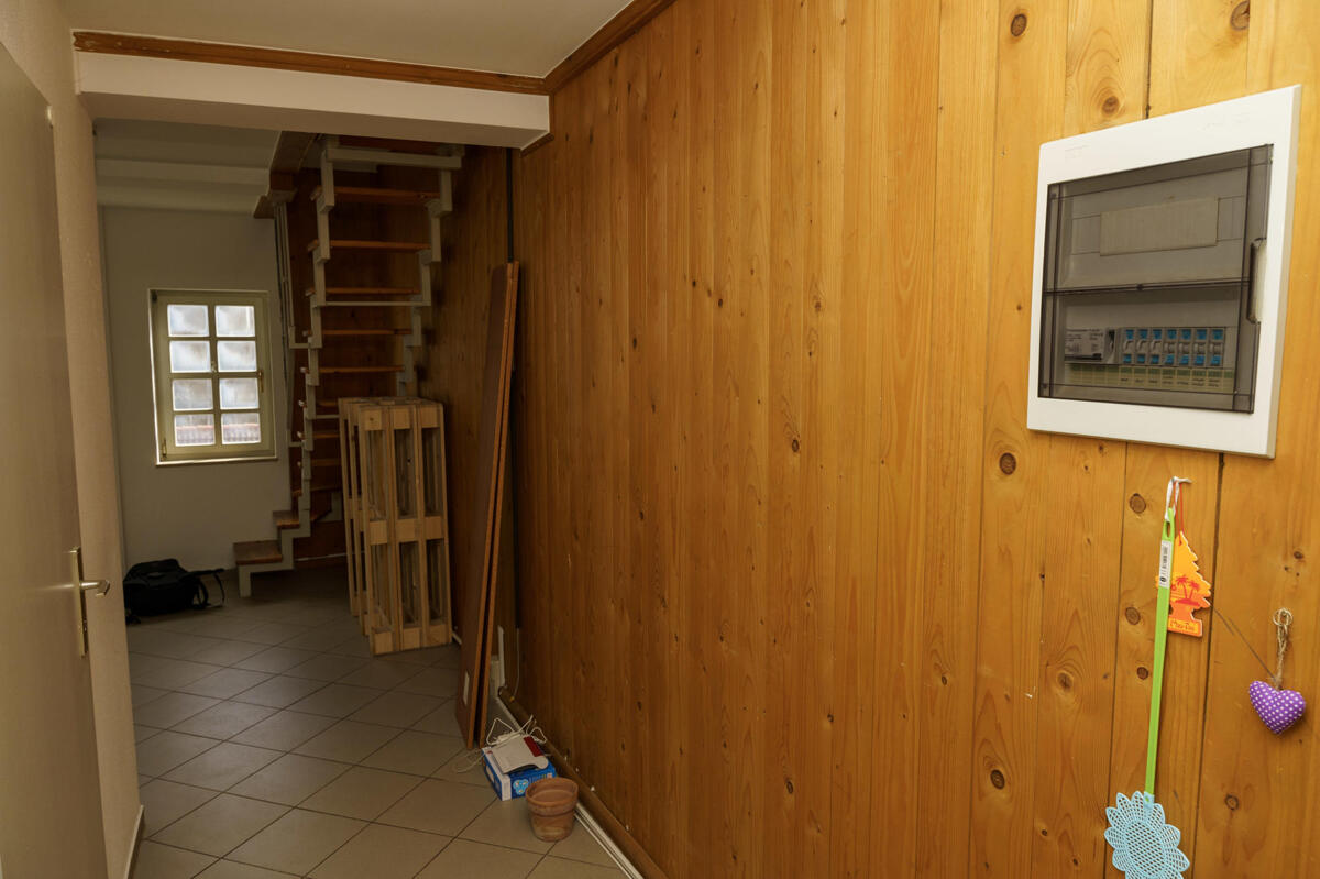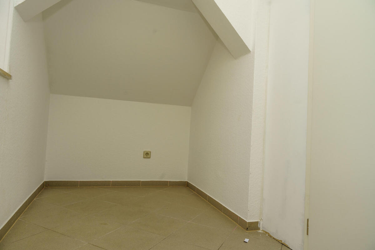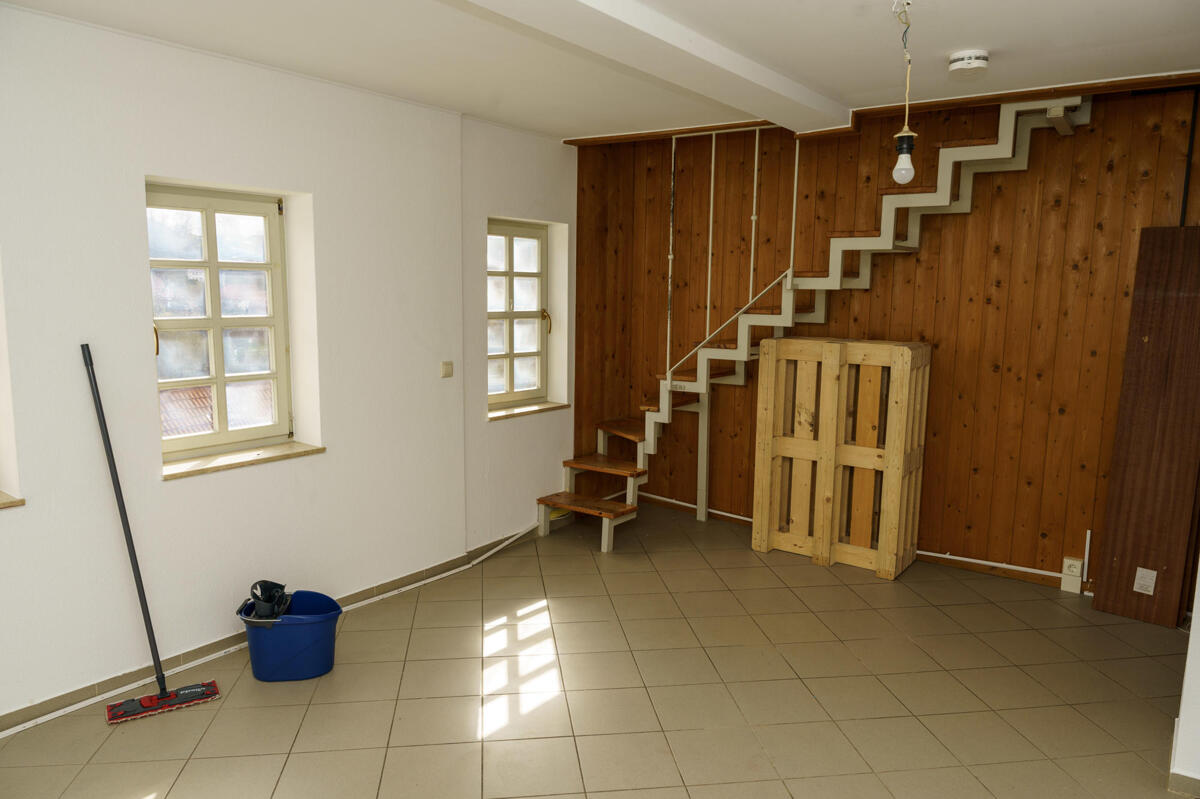 Vom hellen Wohnzimmer führt eine Treppe in einen weiteren Schlafraum im Dachgeschoss. Die Küche ist über das Wohnzimmer zu erreichen und verfügt über ein Fenster.